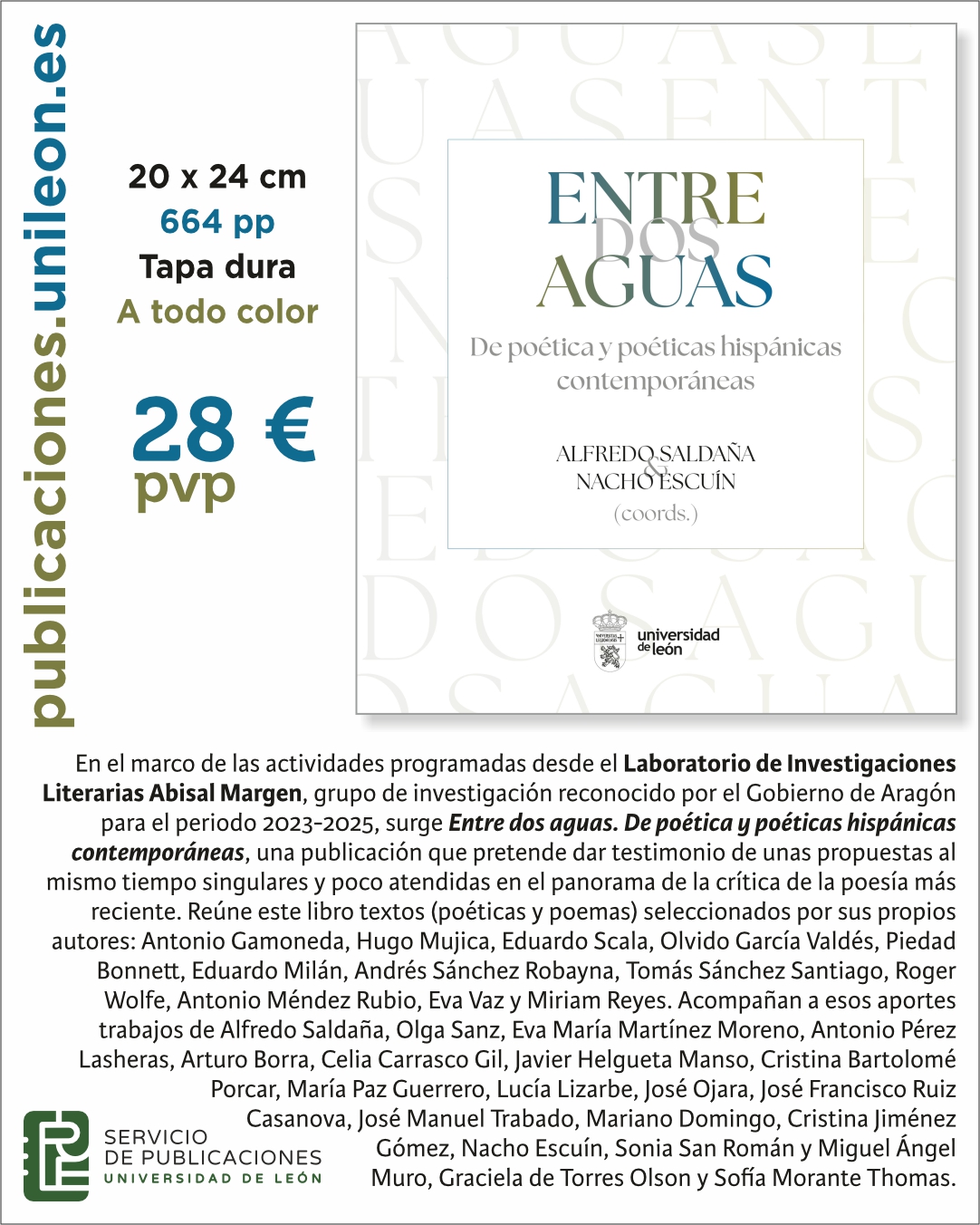 El Servicio de Publicaciones de la Universidad de León pone a la venta ENTRE DOS AGUAS. De poética y poéticas hispánicas contemporáneas, coordinada por Alfredo Saldaña y Nacho Escuín.
