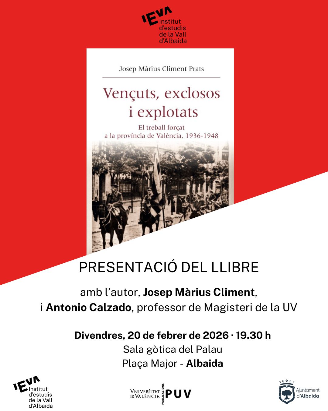 El viernes 20 de febrero se presenta el libro de Josep Màrius Climent Prats, "El treball forçat a la província de València, 1936-1948" en la Sala gótica del Palau de Albaida.