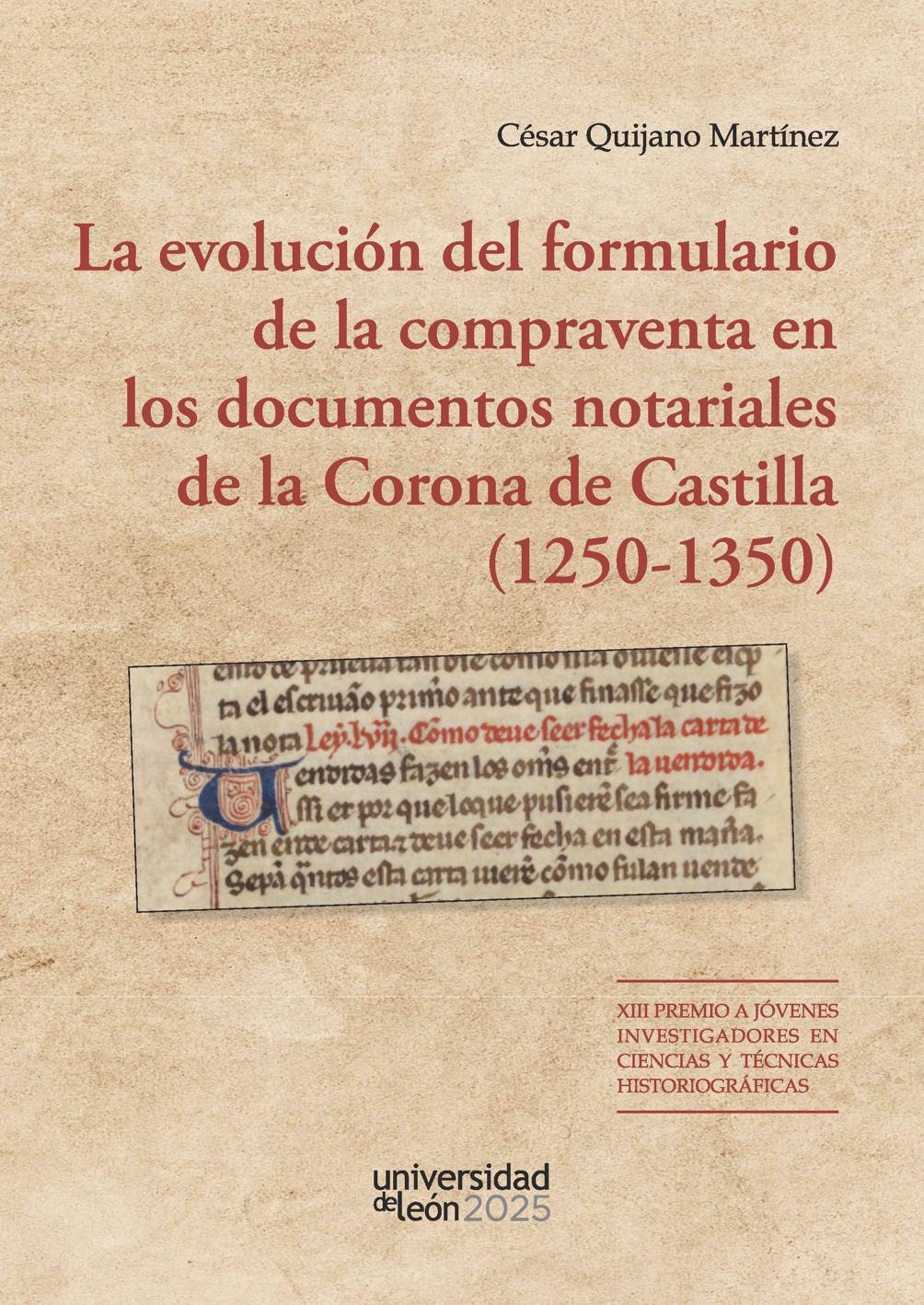 LA EVOLUCIÓN DEL FORMULARIO DE LA COMPRAVENTA EN LOS DOCUMENTOS NOTARIALES DE LA CORONA DE CASTILLA (1250-1350), de César Quijano Martínez, corresponde a la coedición junto a la Sociedad Española de Ciencias y Técnicas Historiográficas del XII Premio a Jóvenes Investigadores en Ciencias y Técnicas Historiográficas.